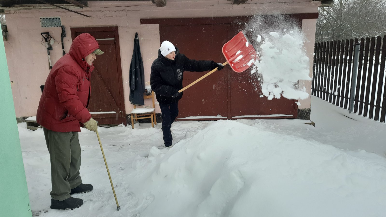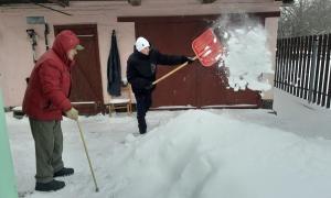 Члены волонтерского отряда ПО БРСМ "Кто, если не я!" ГУО "Средняя школа №3 г. Слонима" убирают снег у пожилых и одиноко проживающих людей.
