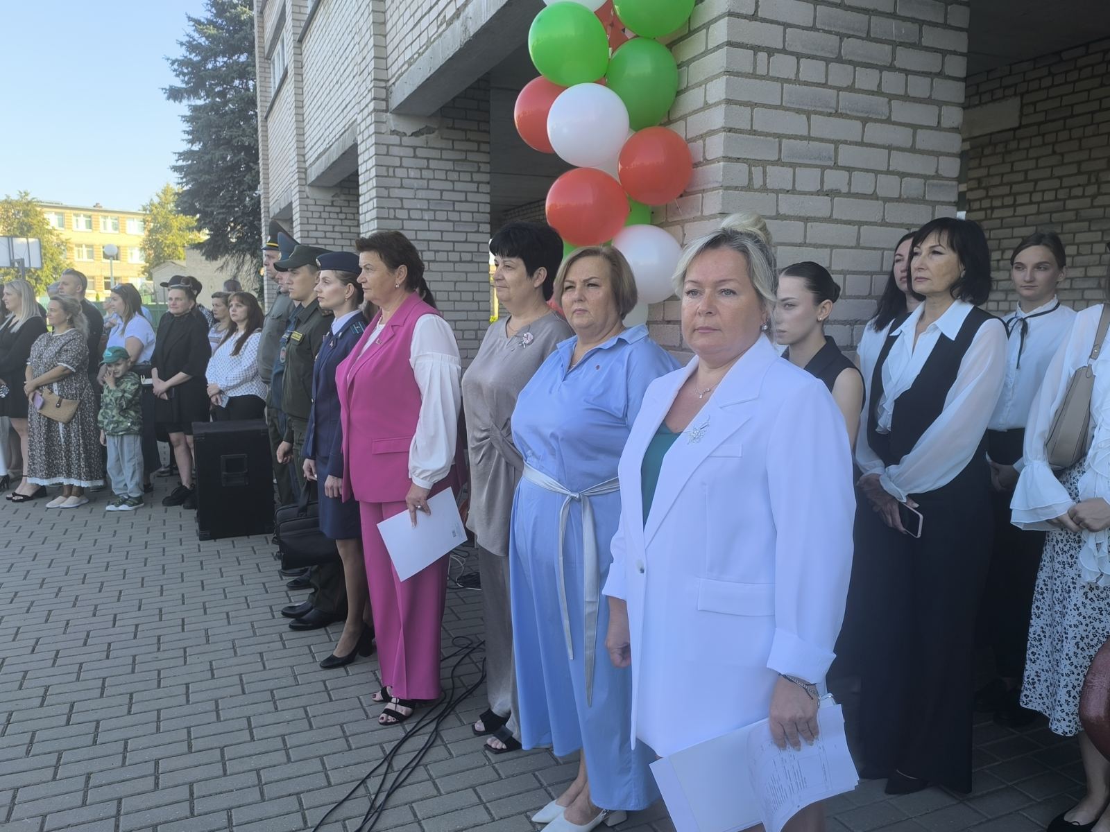 На торжественной линейке присутствовали почетные гости: Юнчиц Н. С., начальник отдела идеологической работы и по делам молодежи Слонимского райисполкома, Яговдик Ю. В., первый помощник прокурора Слонимского района, руководитель отдела Новогрудской епархии по взаимодействию с вооруженными силами и правоохранительнями органами отец Олег Пачковский, заместитель военного комиссара, начальник группы территориальной обороны Езневич С.В., старший лейтенант Аркутич В.М., психолог 40-го отдельного гвардейского батальона, старший инспектор сектора идеологической работы и кадрового обеспечения Слонимского РОЧС майор Добриян К.А.