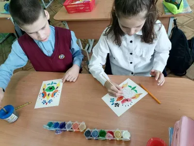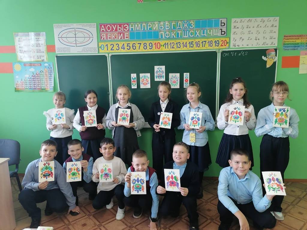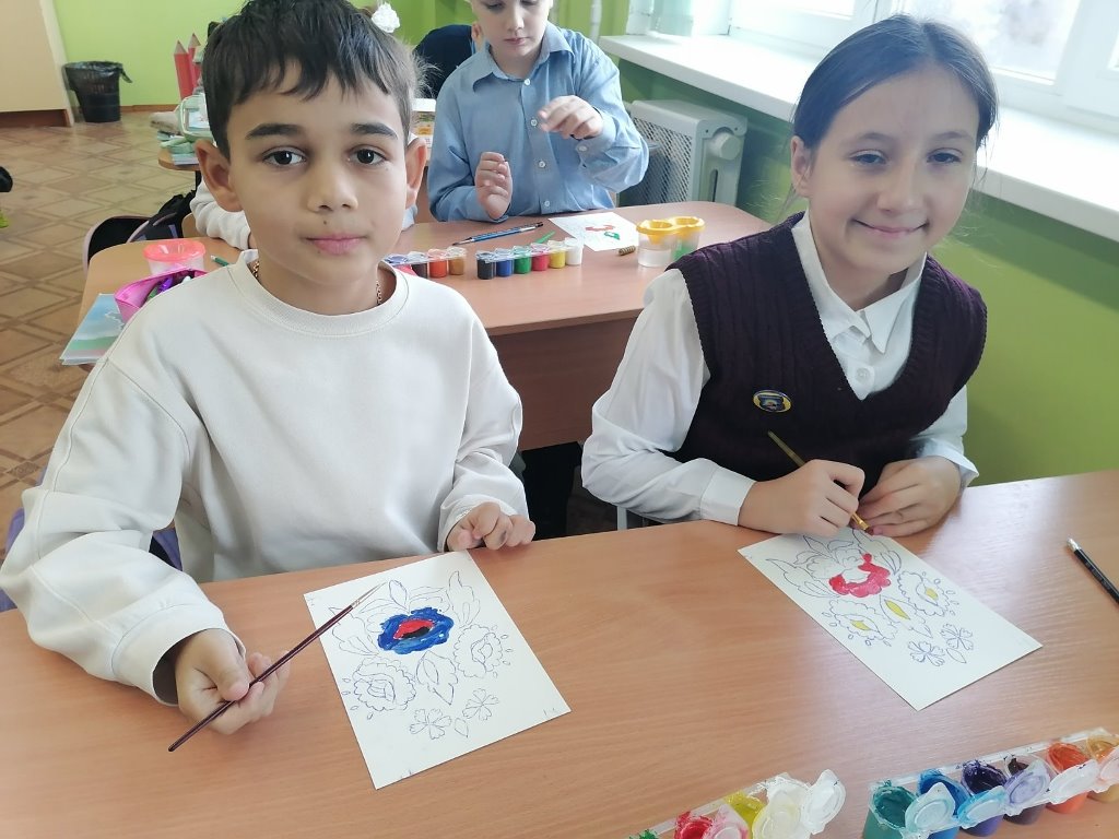 Первая учебная неделя 2 четверти для учащихся 4 "Б" класса прошла под знаком художественного творчества. Мастера из центра ремёсел помогли ребятам окунуться в мир "оговской росписи".