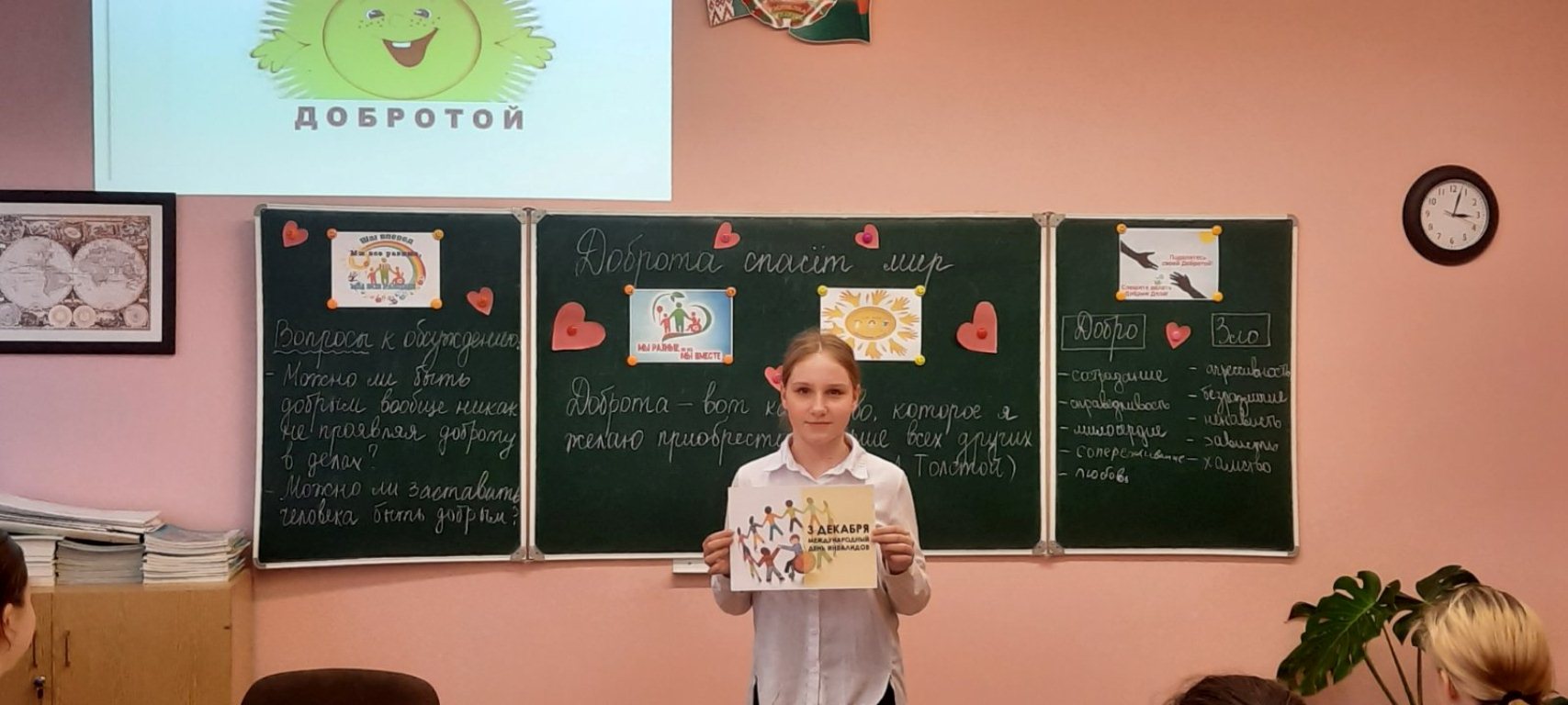 В ГУО «Средняя школа № 3 г.Слонима» в 7 «Б» классе 3 декабря 2025 г. прошёл необычный и важный классный час, посвящённый Международному дню инвалидов. Тема мероприятия — «Доброта спасёт мир» – стала не только актуальной, но и глубоко личной для каждого из участников. Учащиеся 7 класса собрались, чтобы обсудить, как важна доброта в нашей жизни и как она может изменить мир к лучшему.