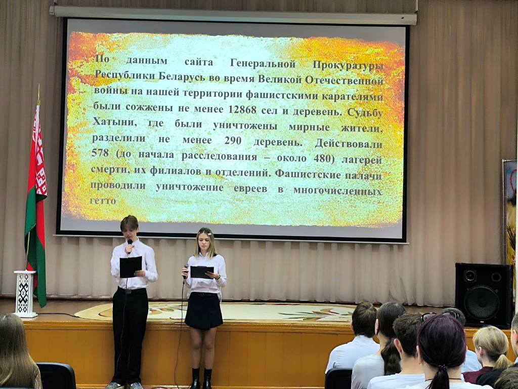 9 декабря в Международный день памяти жертв геноцида состоялся урок памяти «Нам не забыть эту боль». В ходе мероприятия для учащихся была актуализирована информация по результатам расследуемого уголовного дела по факту геноцида населения Беларуси во время Великой Отечественной войны и в послевоенный период, возбужденного в 2023 году Генеральной прокуратурой Беларуси.