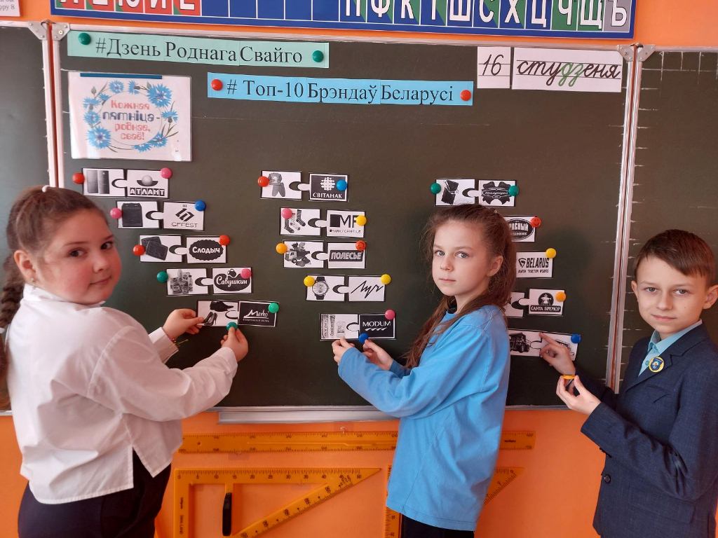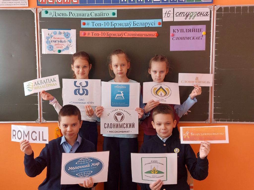 16 студзеня вучні пачатковай школы нашай навучальнай установы далучыліся да праекта "Кожная пятніца - роднае, сваё". Падчас акцыі #Топ-10БрэндаўБеларусі хлопчыкі і дзяўчынкі пазнаёміліся з самымі вядомымі таварамі, якія зроблены ў нашай краіне, а таксама стварылі #Топ-10БрэндаўСлонімшчыны