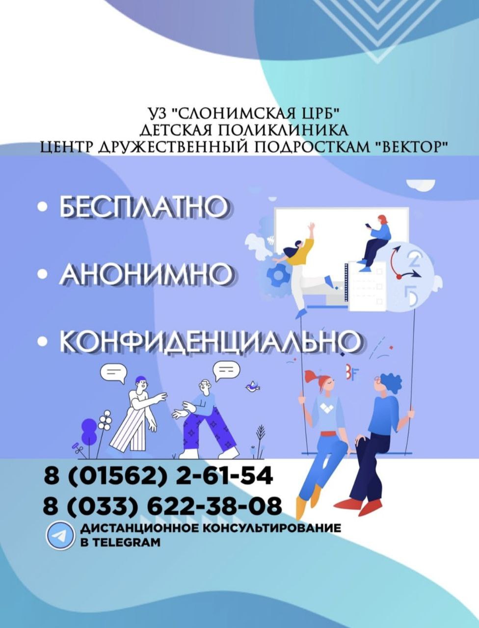 В Слониме открылся Центр дружественный подросткам "Вектор", ждём вас по адресу УЗ "Слонимская ЦРБ", улица Войкова 51 каб. 2.8 0 15 62 2 61 54 8 0 33 622-38-08
