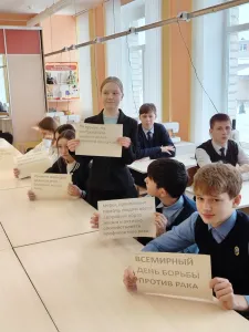 Всемирный день борьбы против рака - памятная дата, провозглашенная " Международным союзом по борьбе с онкологических заболеваниями и отмечается ежегодно 4 февраля. На эту тему мы, 8в класс, разговаривали на классном часу.