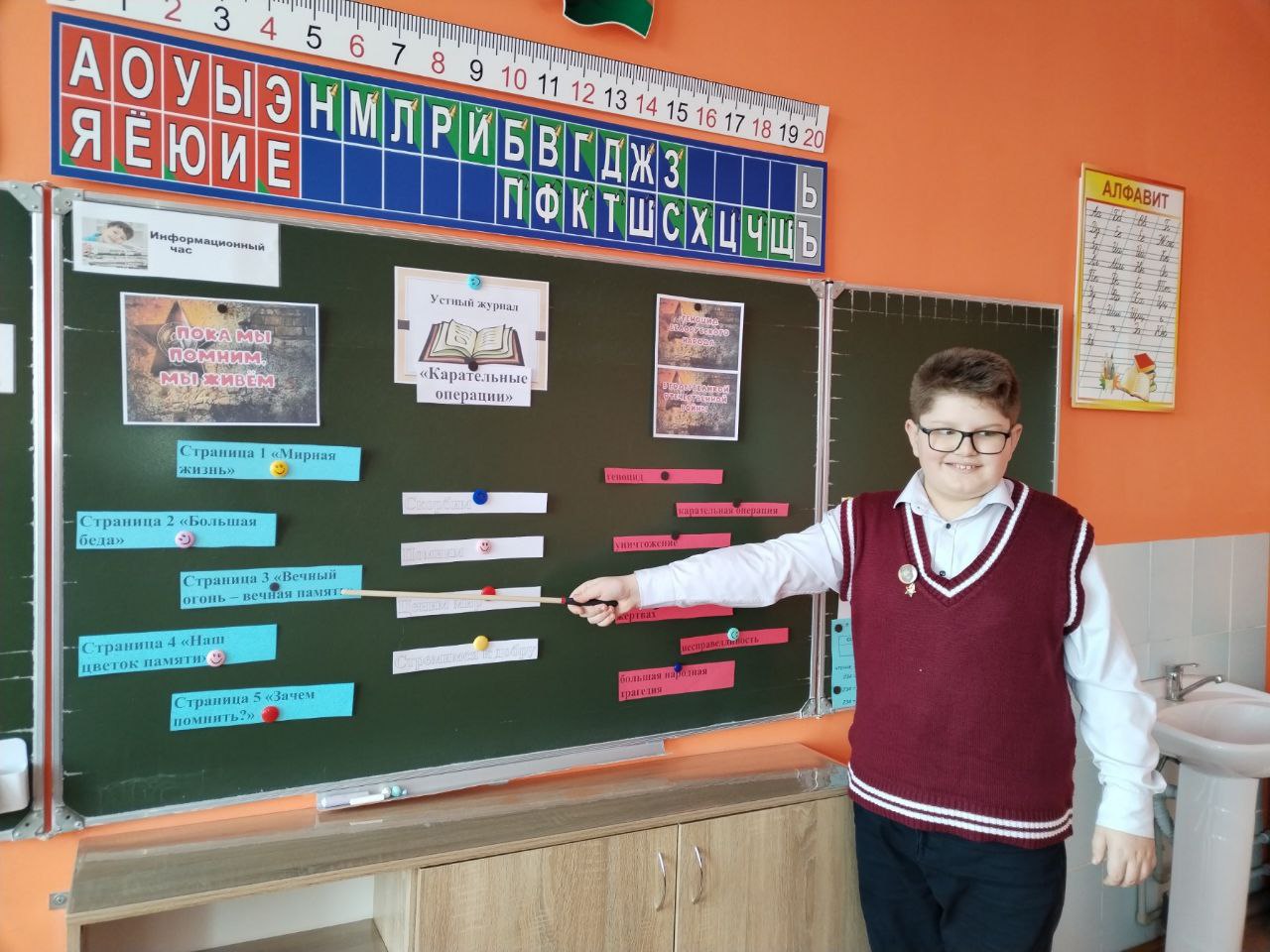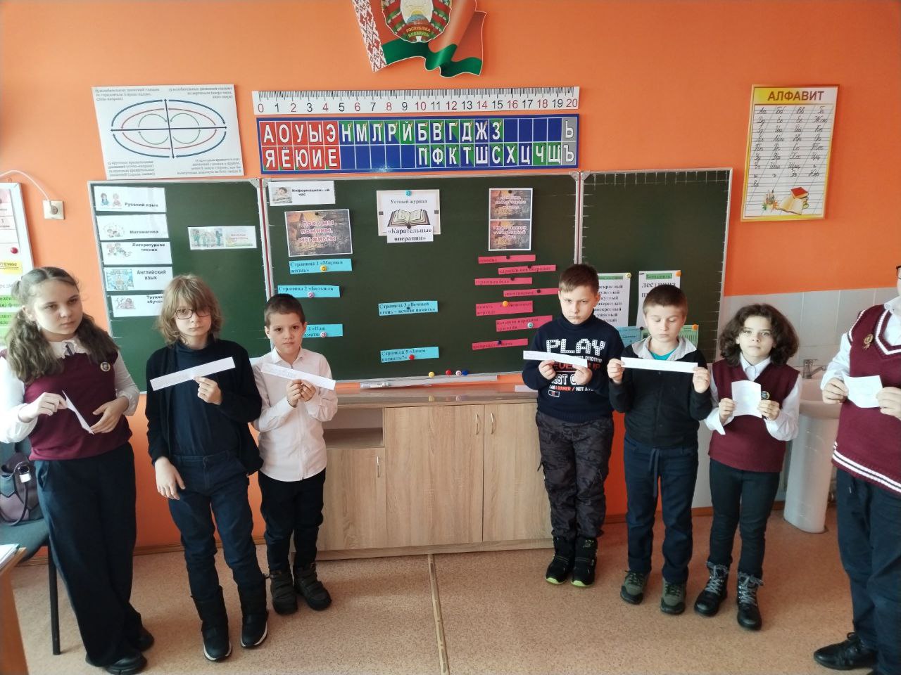В 3 «В» классе прошёл информационный час “Карательные операции” с использованием учебного пособия «Геноцид белорусского народа в годы Великой Отечественной войны». Ребята листали необычный устный журнал, посвященный памяти о простых людях — детях, мамах, бабушках и дедушках, чьи жизни унесла война. Страница «Мирная жизнь» рассказала о довоенной жизни, где люди растили детей и радовались солнцу. Страница «Большая беда» поведала о карателях, которые сжигали дома вместе с жителями. Вместе мы зажгли воображаемую свечу памяти, бережно неся ее в своих ладонях. Страница «Зачем помнить?» заставила учащихся поразмышлять. Мы помним о прошлом, чтобы ценить наше мирное настоящее — возможность учиться, гулять и смеяться. Эта память учит нас беречь каждый тихий день и стремиться к добру. Сохраняя память о жертвах, мы оберегаем будущее и мирное небо над головой.