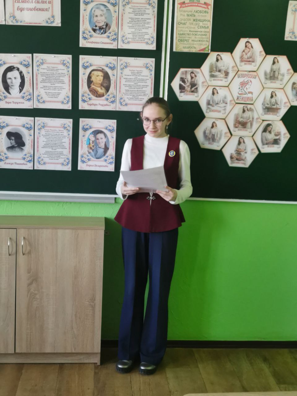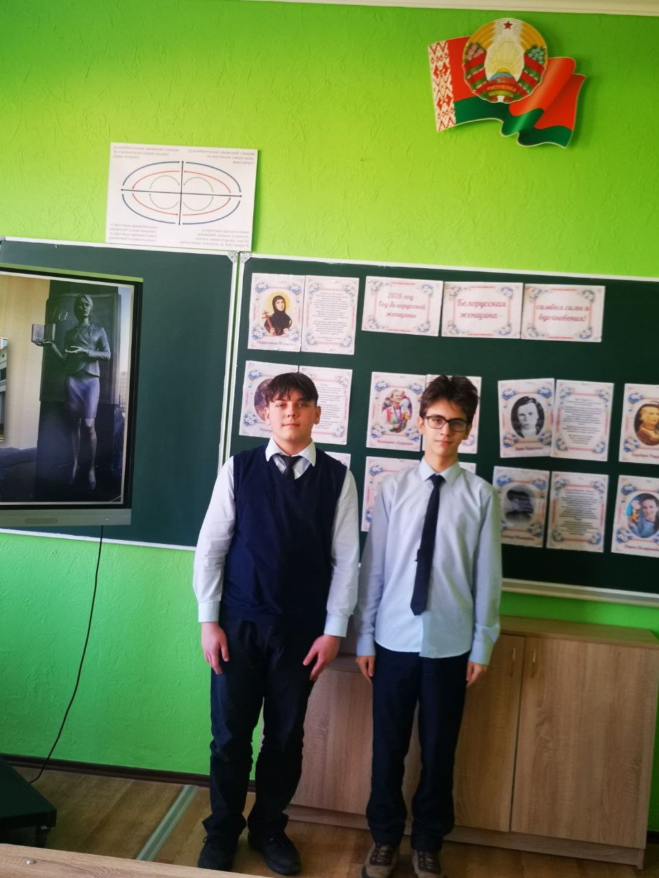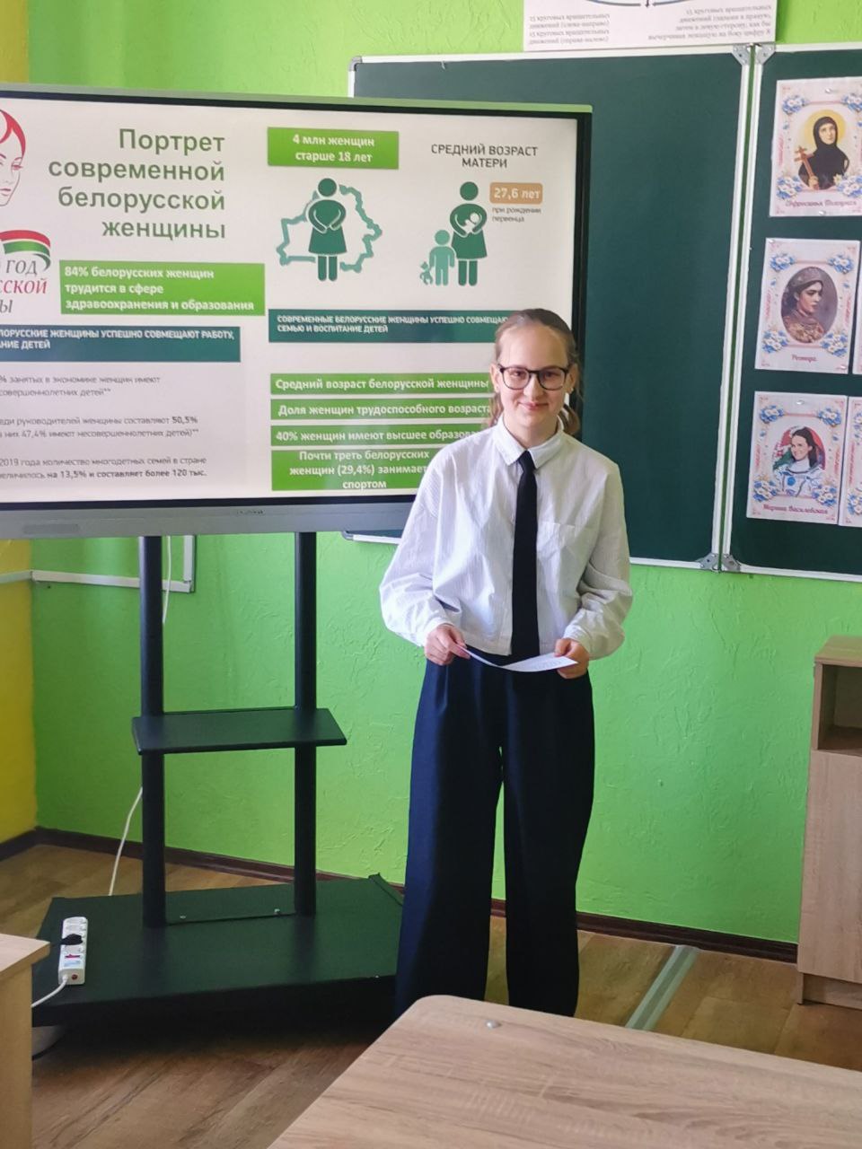Единый урок «Белорусская женщина – символ силы и вдохновения» собрал 5 марта учащихся 8 «А» класса на интересный и содержательный диалог. Ребята рассуждали о роли женщины в белорусском обществе, узнали много нового о знаменитых белорусках, попытались определить секрет их успеха.