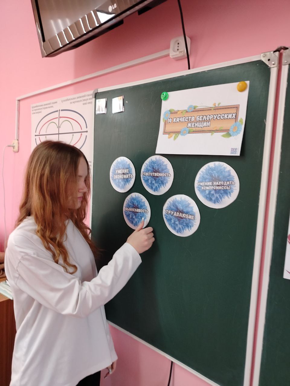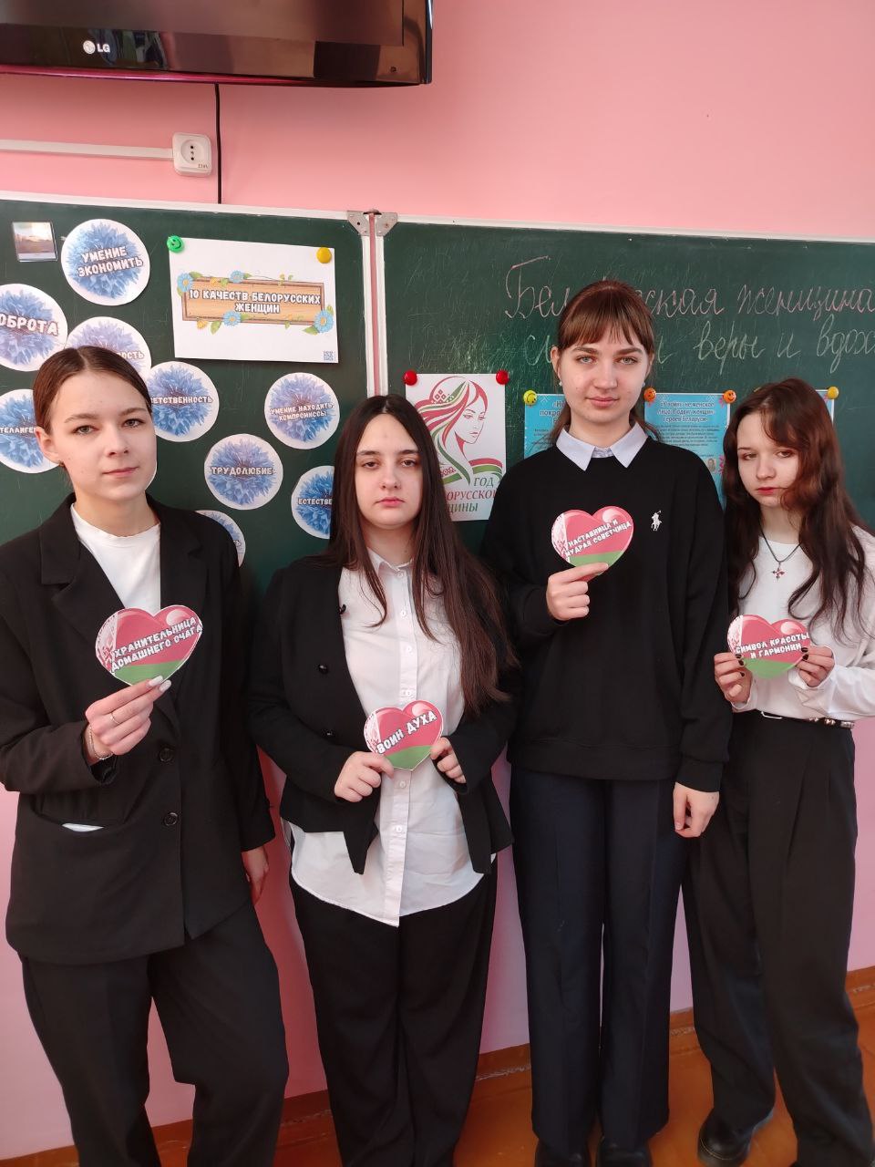 В рамках идеологического воспитания в 11 классе прошёл классный час "Белорусская женщина-символ силы и вдохновения", направленный на формирование у учащихся уважения к роли женщины и труженицы, матери и активного члена общества.