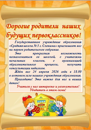 В 1-ые классы государственного учреждения образования «Средняя школа № 3 г. Слонима» принимаются дети, которым на 1 сентября 2026 г. исполняется шесть лет или по желанию одного из законных представителей несовершеннолетнего лица с более позднего возраста. По заявлению одного из законного представителей несовершеннолетнего, при наличии решения педагогического совета, допускается приём ребёнка, которому шесть лет исполняется в текущем календарном году (пункт 3 статьи 151 Кодекса об образовании).